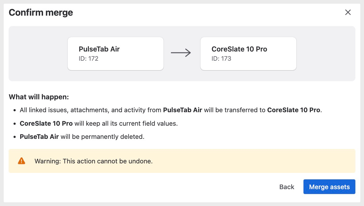 The system will transfer all linked issues, attachments, and activity from the asset being deleted to the asset you’re keeping.